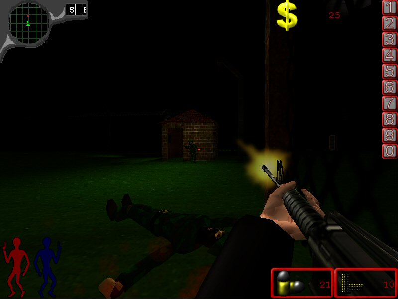 I really like the HUD. Just perhaps tone down thae dollar sign a bit. The darkness is okay. You can kick in the default light level a little in the blueish green range to pull out some highlights in the shadowed areas. The shot in the ductwork is cool. Reminds me of 24!!